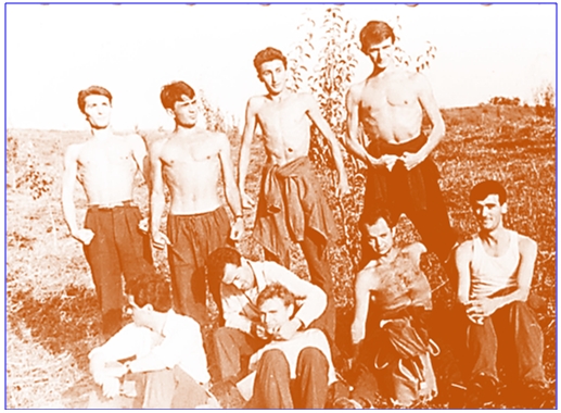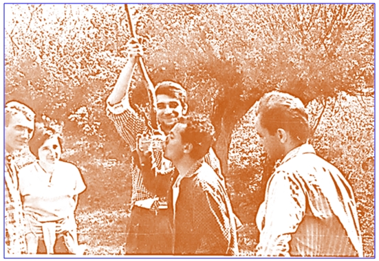 Paşti - 1968. Manifestarea interesului pentru mielul la proţap. Jos: Amica lui Butyurka, Minerva, Bandrabur, sora lui Dodoiu, Ganea, Butyrka. În picioare: Ţârcomnicu, Lupchian Gaal, Iordache, Leon, Nicolae, Dodoiu. |