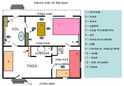 Odăița casei noastre avea doar un pat mare din lemn, cu saltea umplută cu paie şi în faţa patului era soba cu plită şi cuptor. Podeaua şi podina erau din scânduri. Un geam cu două ferestre micuțe dădeau spre curtea interioară, de unde puteau fi văzute: grajdul, cotețul de porci, cotețul de păsări şi toată ograda, până în fundul grădinii şi chiar după oboare (câmpia de la marginea satului). Geamul avea şi giurgiuvele (bare metalice), care să împiedice pătrunderea hoților.